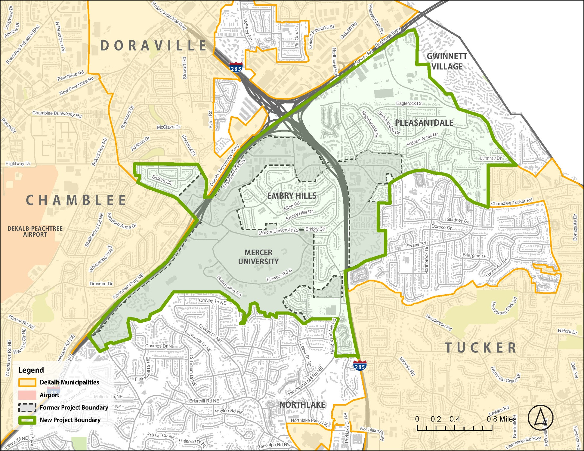 This study will focus on the area depicted in green in the map shown below. This area sits near the intersection of I-85 and I-285 and includes a number of community amenities, such as grocery stores and libraries, a number of single family and multi-family residential neighborhoods, and many regional destinations such as Mercer University – Atlanta Campus and Silverbacks Park.